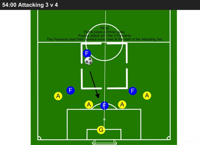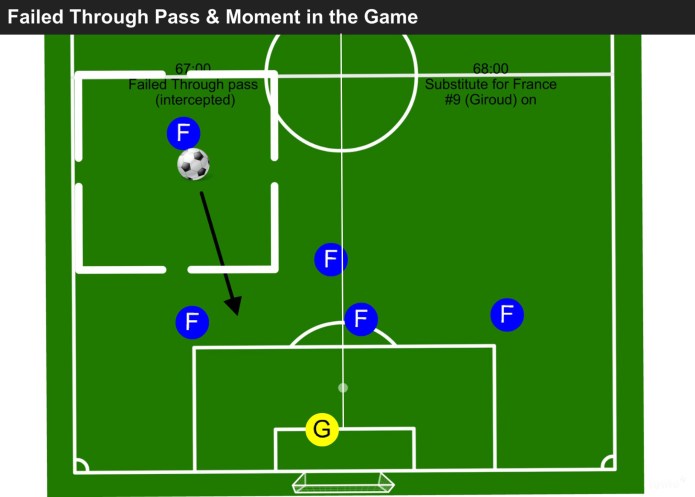 Game Changing Moment: The award of a penalty to France. 1-0. Momentum changes, and we see France attacking into the Final Third, quicker, with 5 players ahead of the ball.